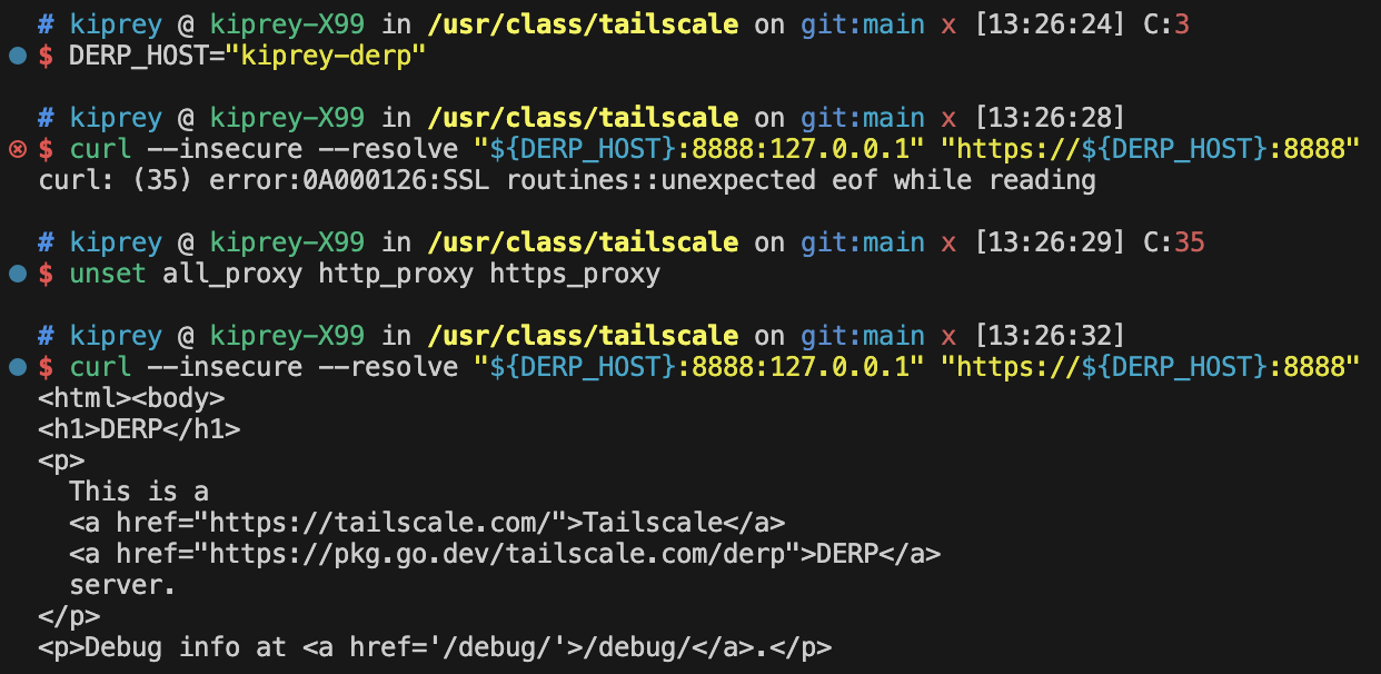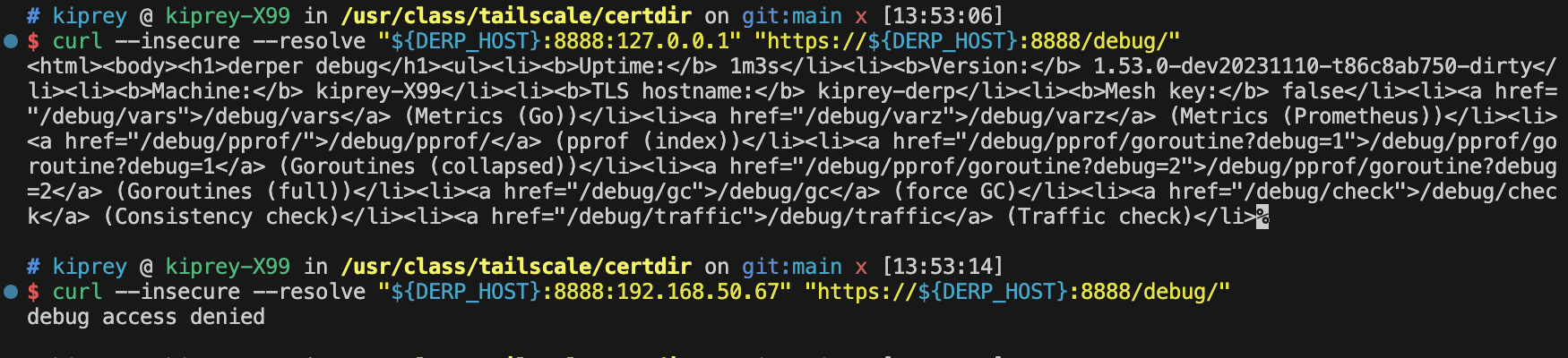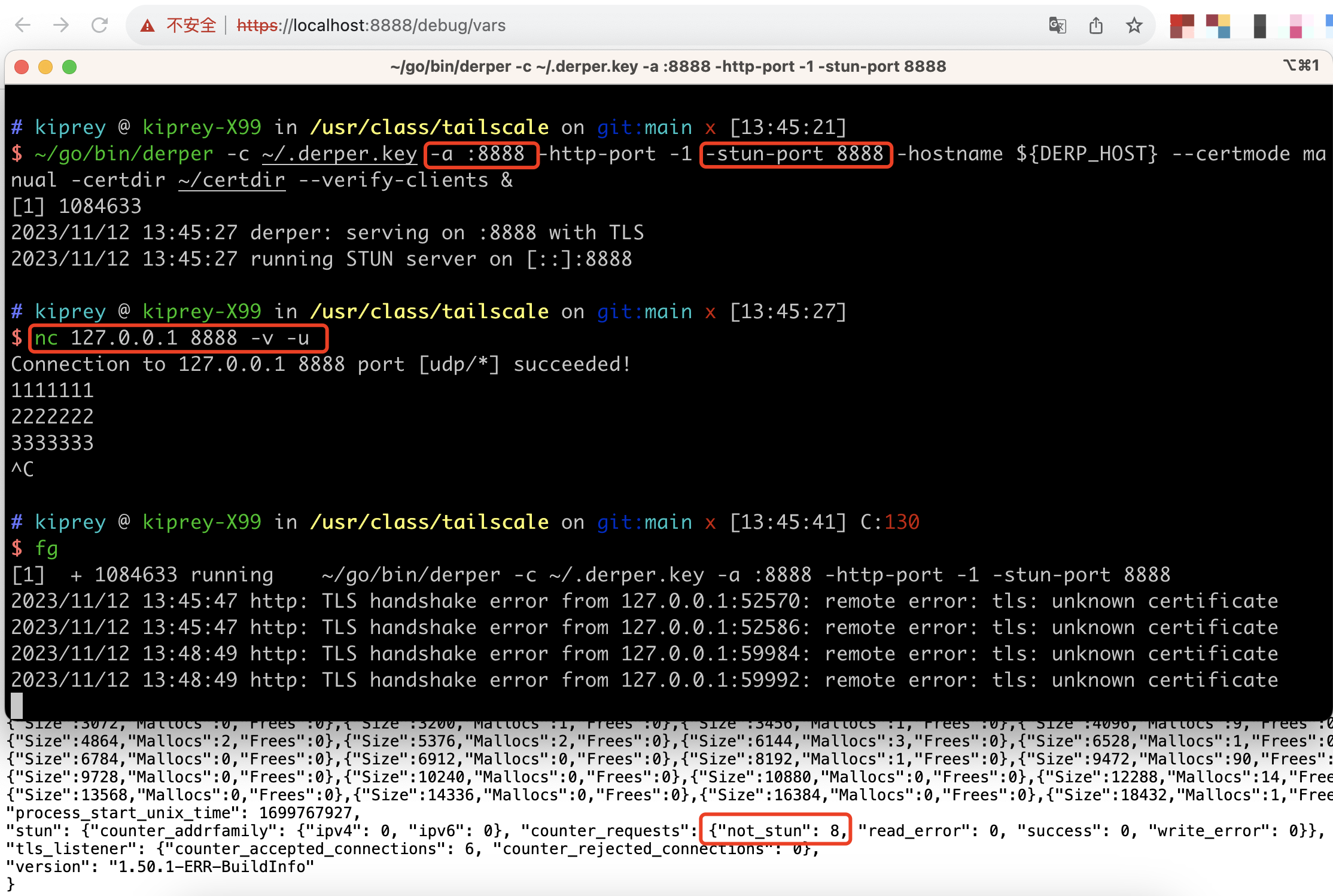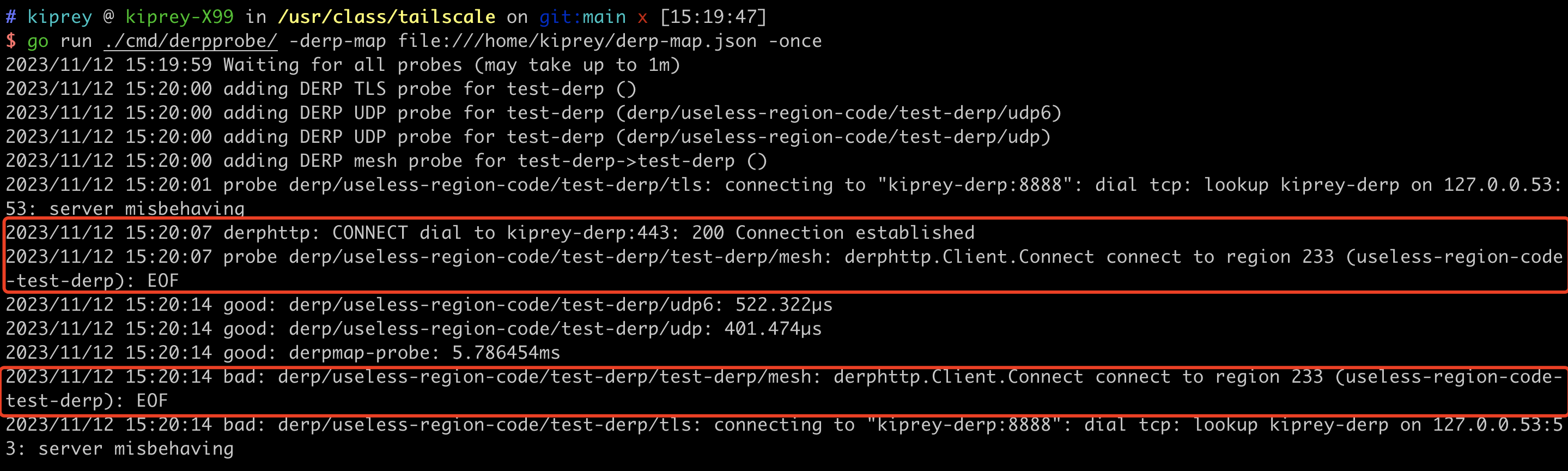 启动 DERP 服务后,在另一台机器上做连通性测试: