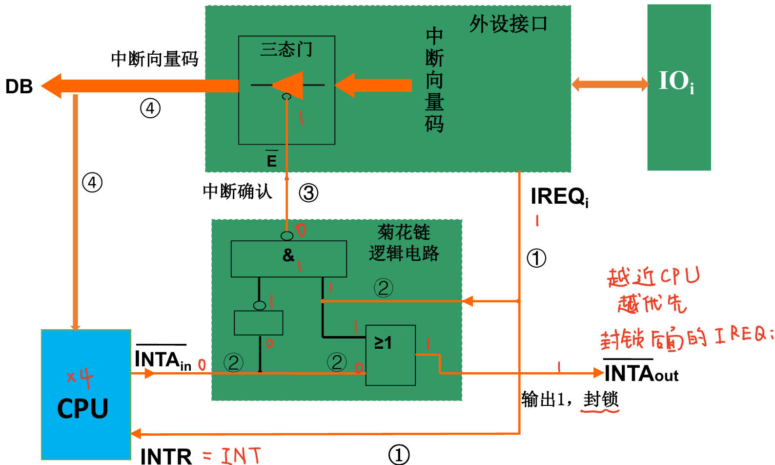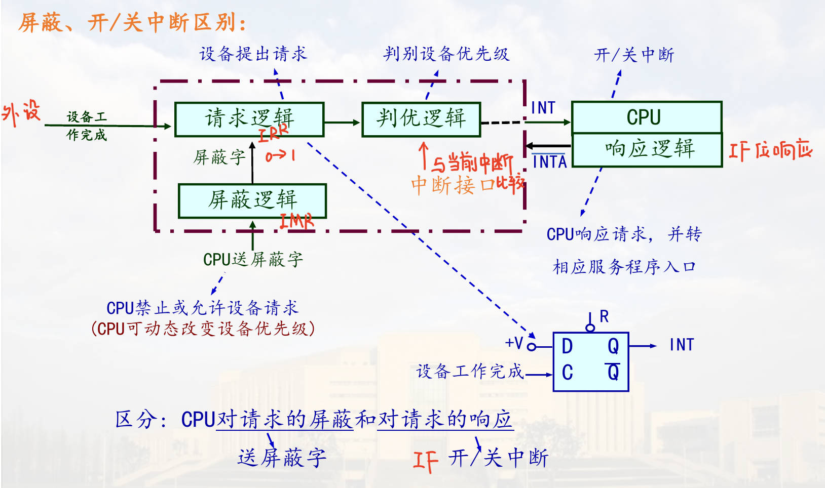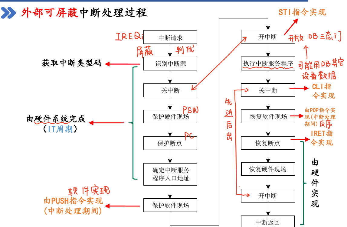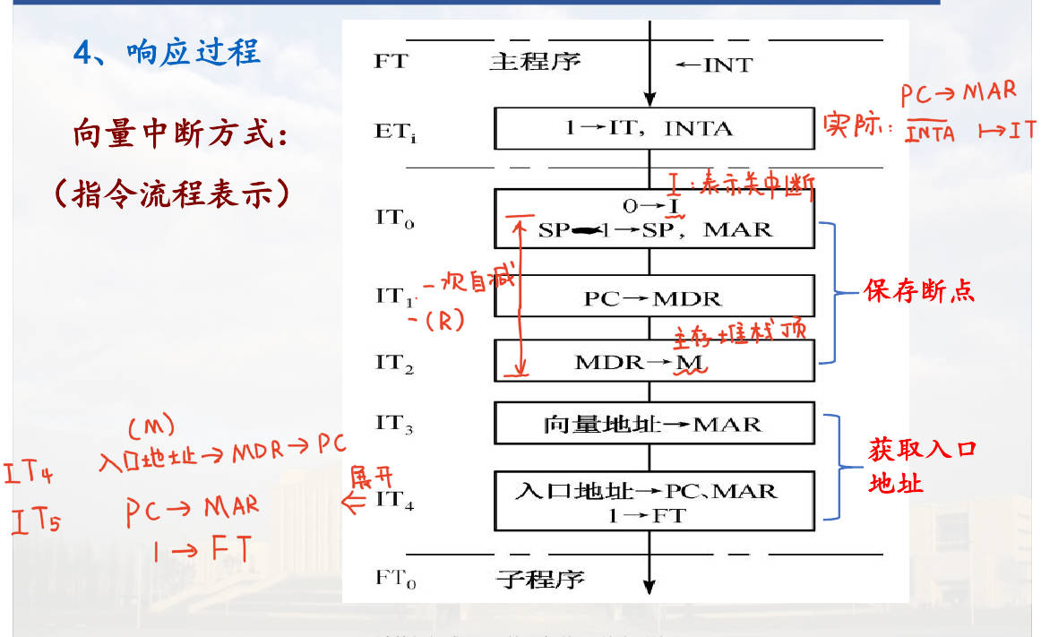 - 逻辑: 当外部设备发来中断信号(INT),且CPU允许中断(PSW中I=1),CPU在指令执行结束周期(ET)发出中断响应信号(INTA, Interrupt Acknowledge)。