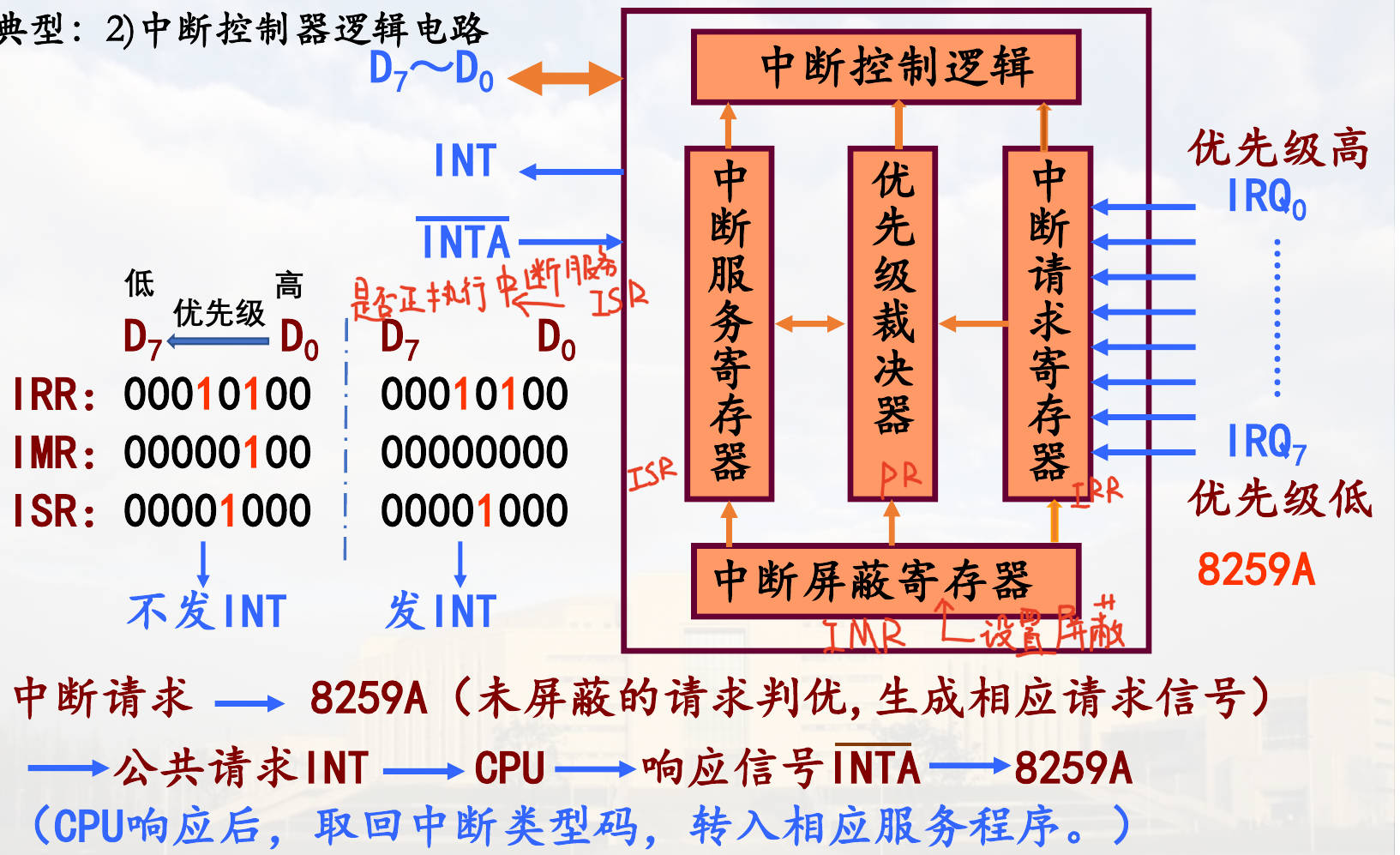 - 判优 (Priority): 此时有没有更高级的中断正在处理?(比较 ISR 寄存器)。