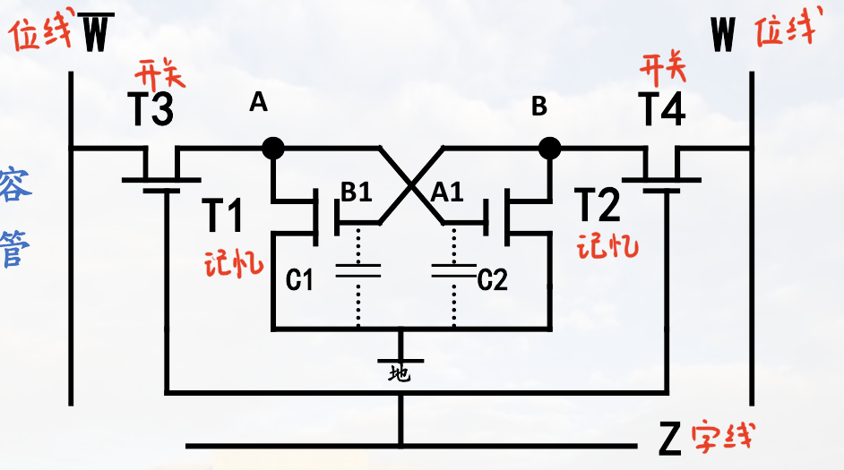 - 选通: 字线 $Z$ 变高,$T_5, T_6$ 导通。